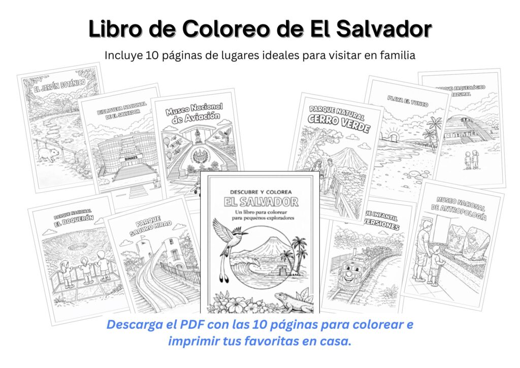 Descubre y Colorea El Salvador — Este libro incluye 10 páginas para colorear inspiradas en lugares icónicos y favoritos de las familias en El Salvador.